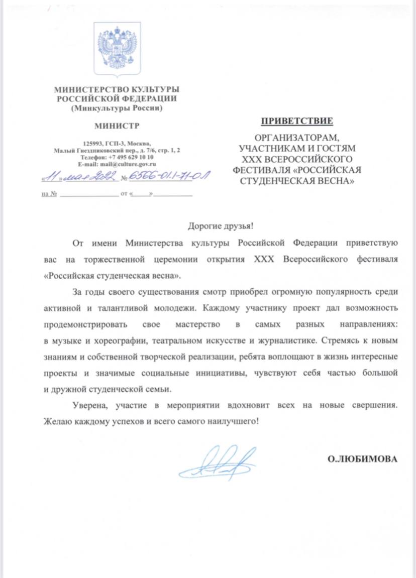 Приветственный адрес организаторам, участникам и гостям ХХХ Всероссийского фестиваля «Российская студенческая весна» от Ольги Любимовой