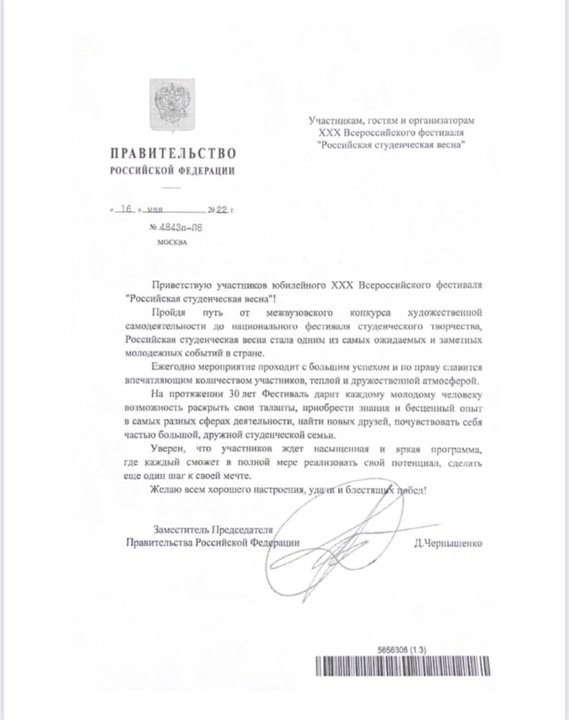 Приветствие в адрес организаторов, участников и гостей ХХХ Всероссийского фестиваля «Российская студенческая весна» от Дмитрия Чернышенко